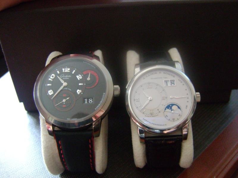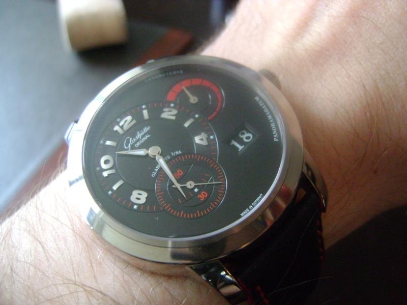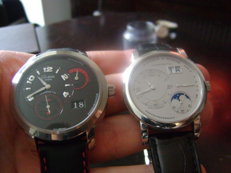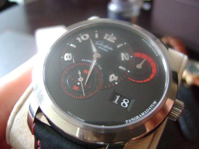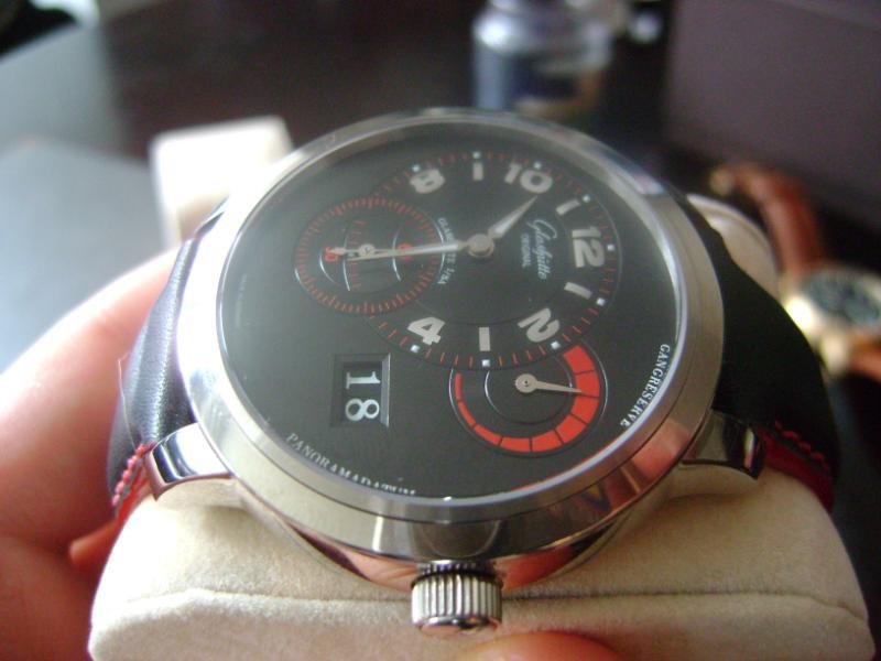 So I got this watch the other day and was thrilled to finally get my hands on a Pano XL. This particular model was released a couple of years ago at Basel and I really wanted it after I saw all the amazing photos posted during the Basel fair. I thought the color combination on this piece was / is outstanding and after a few days of owing it I wanted share my thoughts seeing that not much has been written about this watch previously. First and foremost, it’s a very difficult watch to photograph as there is no anti-reflective coating on the crystal. You really have to shift the watch around to get photos without the camera in the picture as well. I would have preferred that GO coat the crystal with anti-reflective material but what can you do. I have owned a Panomatic Lunar before and like the 39mm case size but I will say that the 42mm case size of the XL line works really well too. Unlike the dial of the Grand Lange 1 which looks unbalanced at times, this particular model doesn't suffer from an unbalanced look IMO as there is not much free space on the dial.