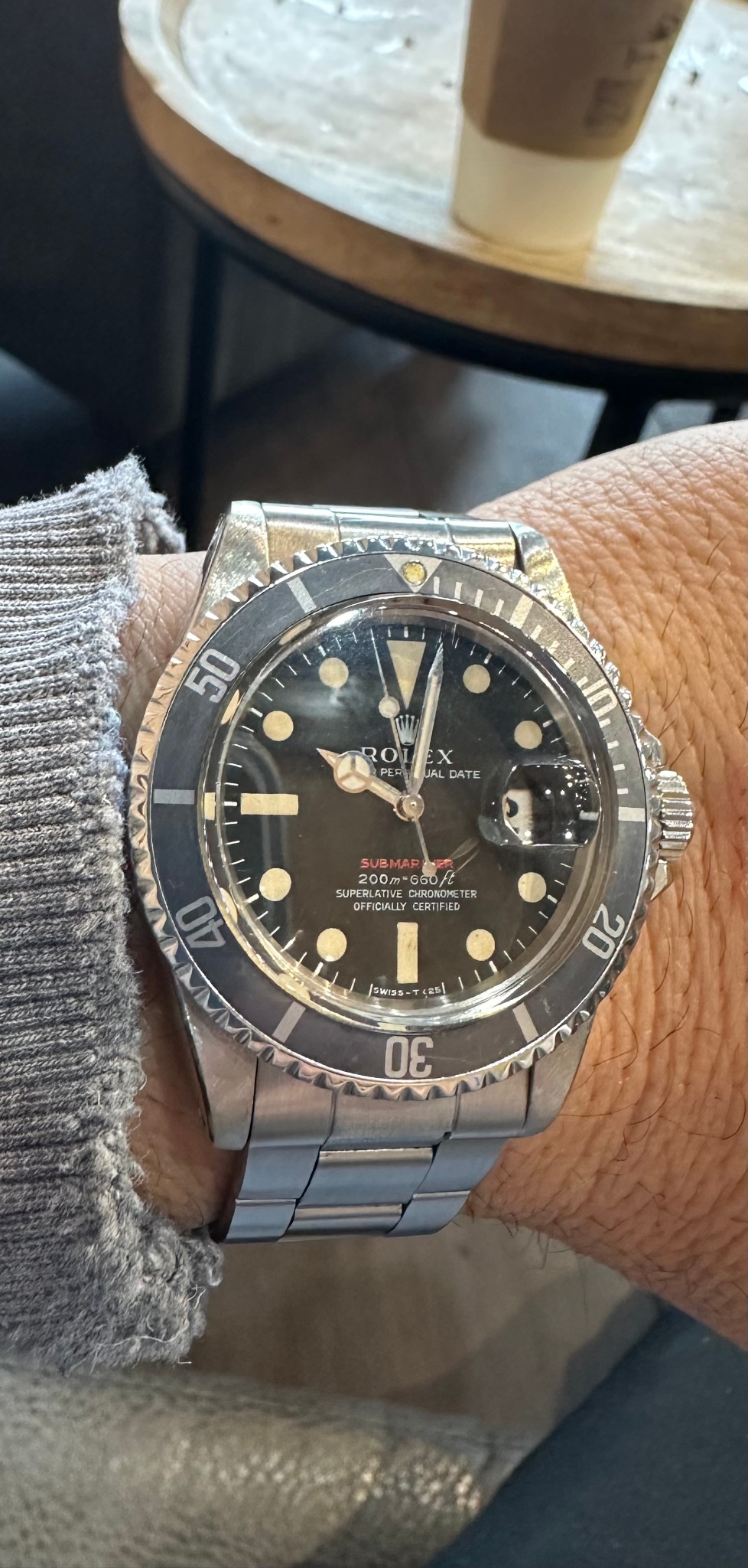 I had a nice red sub for many years but I sold because I hoped to find an earlier MF example that was a bit more patinated. Luckily, this popped up at an auction not too long ago and somewhat to my surprise I ended up with the high bid. It came with a bunch of accessories including service papers from 2011, anchor, hang tags, wallet, literature, period correct box and a punched chronometer certificate that appears to be well-aged so it could actually be original (although I know many of these are faked). The bracelet matches the date inside the case back although it is one link short.