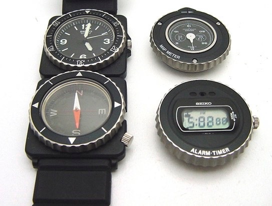 The Fieldmaster “Contra” Watch kit with multiple units that clipped into a ‘strap’ even had a distance meter you could roll over a paper map to calculate distances. A compass, a timer/alarm, and get this — are you ready? — a watch!