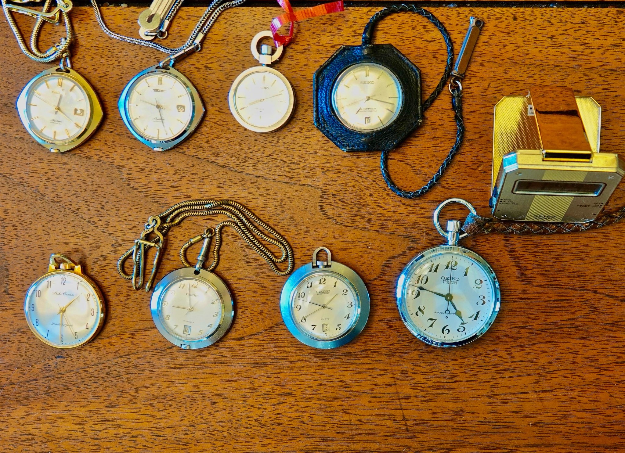 Seiko pocket watches, even an automatic watch that sometimes winds itself if you walk aggressively or keep your hands in your pockets all the time.