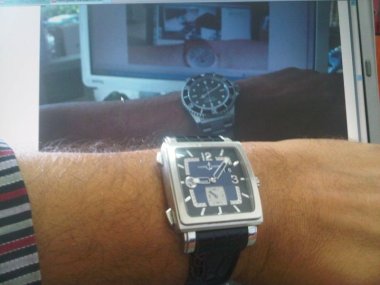 Sellers Comments : a great travel companion with all the boxes and papers. Watch Condition : MINT Model: : Quadrato Dual Time Stainless Steel Description: : Square case. Two tone Dial - Black outer diameter & Blue inner dial. Small Seconds Sub-Dial at the 6 o'clock position. Applied Silver Toned Ind