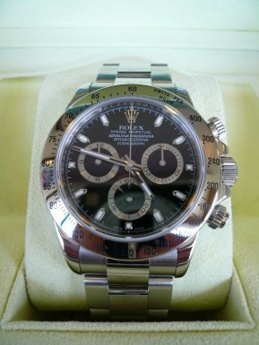 Here is my mint condition Stainless Steel Daytona, M Series bought new from Rolex AD in August 2008. The condition of the watch and bracelet is virtually as new save for one light scuff on the clasp which would easily buff out if desired. Otherwise perfect. Package of box & papers is 100% complete -