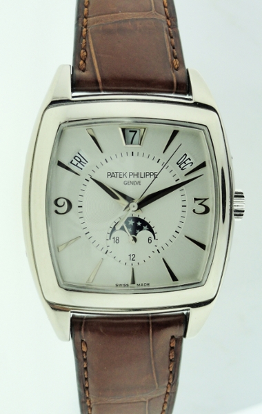 Patek Philippe Complicated Gondolo Calendario - Annual Calendar This Patek Philippe Gondolo Calendar watch features a tonneau-shaped 18K white gold case, a sapphire crystal, a white dial, and a crocodile leather strap with an 18k white gold Patek Philippe tang buckle. The Patek Philippe Ref. 5135G G