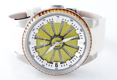 NIB stainless steel Perrelet Turbine XS with baguette Citrine bezel. Yellow dial reveals diamonds beneath the Turbine when rotating. Comes on a white sateen strap with a stainless steel deployant buckle. Unworn condition with box and papers.