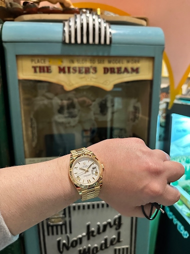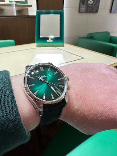 Just a quick pick I took a few months ago when I went to pick up my DD40 I had to snap this pic in the Rolex room while I was waiting for my DD to be sized. I just loved how the Moser played off with the Rolex green. I bought the bracelet for this several months ago but still have not put it on. Fro