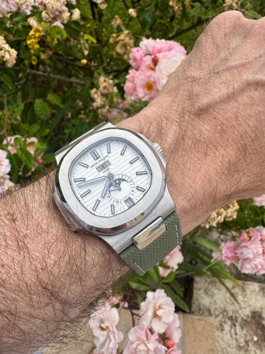 Here it is with a white dial 😉 (with a kaki cordura strap for the summer)