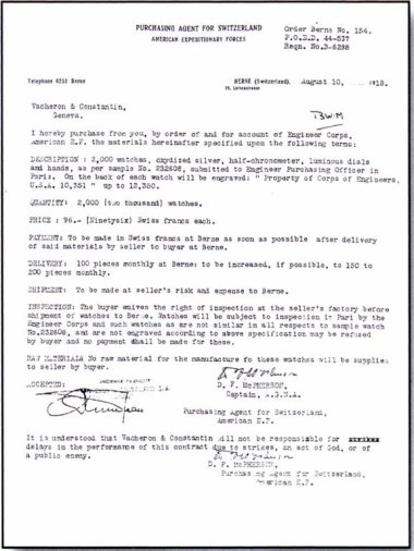 A nice article, but... you wrote; The AEF order for Vacheron & Constantin was signed in May of 1918 for 5,000 pieces to be delivered in lots of at least 100 per month and 150-200 whenever possible. By the time deliveries concluded in 1920, a total of 3,289 Vacheron & Constantin timepieces had been r