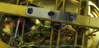 Don, Hopefully the following picture will be helpful. The pallet fork and escape wheel are rather traditionally placed. The balance is mounted in an angled bridge. The pallet lever has long lever (compared to modern dimensions) and due to the platform style of the tourbillon carriage it is curved to