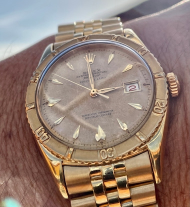... I bought few years back. Crispy conditiion of course, but it's funny for his appealing brownish dial along with no tritium marks and hands. Usually those kind of "no tritium dials/hands" were made for Japanese market (because of their restriction about radioactivity) and in fact this Daydate com