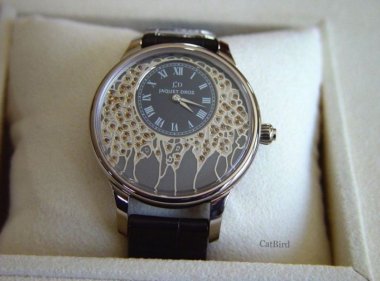 Selling my Limited-edition Jaquet Droz Le Cerisier women's watch which I purchased new in 2006. Watch was limited to only eight pieces. 39mm white gold case, 18-carat white gold hands, slate grey lacquer dial with a hand-engraved motif set with 93 spessartine jewels. The watch includes the original