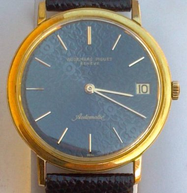 This is a very rare blue textured dial. It is 18K yellow gold, with a 34mm case. It is on a black lizard band. The back of the case has an "AH" engraved. The K2121 movement was recently serviced, and keeps excellent time. The acrylic crystal has light scratches, but it is quite wearable as it is. Th