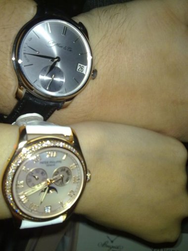 Hi Everyone, Here's a pic of the moser perpetual with my wife's watch on our way to an event. Will try to get more clear pictures of the moser this weekend. Ciao!