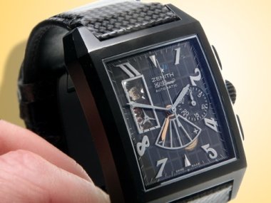 ZENITH Grande Port Royal Open Concept watch (Ref. # 96.0550.4021/77.C550). Zenith El Primero Open Caliber 4021 C & F, 39 jewels, 36,000 vph, 248 Individual Components. Heavy metal oscillating weight decorated with Zenith's Damier pattern. Black Titanium rectangular-shaped, ergonomically-curved case