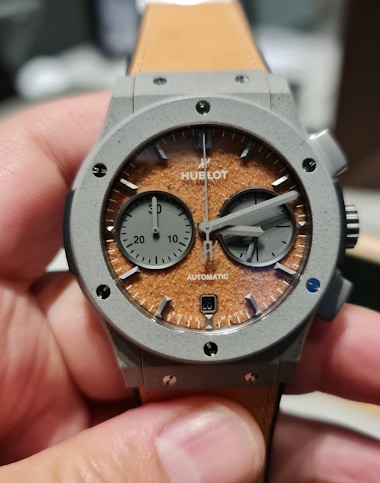 I saw it at the Dubai Watch week last November and I was sold immediately during the presentation of the watch. In addition to a very unique sand dial coming from one special desert in the UAE, the case is made of concrete made in the UAE as well. Also, the strap is made of camel leather, which comp