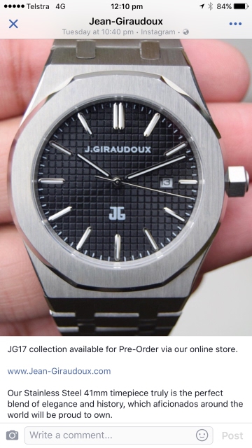 I came across this company that is copying AP designs for their own watches. Has anyone else seen this? https://www.facebook.com/JGiraudoux/videos/1390422774303407/ They are blatantly copying the AP Royal Oak, and as a proud owner of this watch, it makes me angry. Is there anyone here that can bring