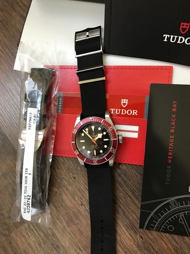 For sale Tudor black bay red bezel in mint condition comes complete with all boxes and papers. This is the leather and NATO straps version so NO bracelet with this one. The watch priced at 2150 usd shipped by Fedex to your door. I have tones of references from all over the world. This message has be