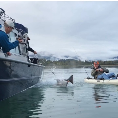 Another view Kayak halibut fishing with Cazalea photo documenting from the tender on the left.
