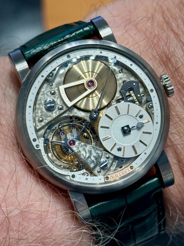 Such a comfortable watch. The bracelet has simple push pins to adjust the size and because it’s so light it drapes around the wrist very well even if worn looser, although I’m told a micro adjust clasp is coming. The movement has so much depth to it. The snail can balance stop is a clever idea. Can’