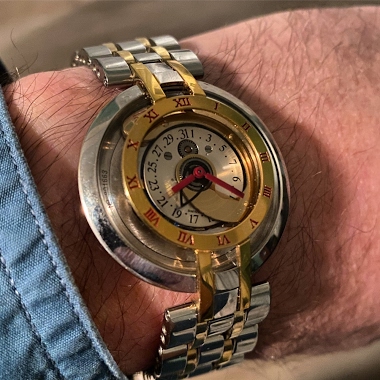 Here’s a rare watch for you! This is a 1989 Jean d’Eve Samara, the first Swiss automatic quartz watch. It launched at Basel in 1987, the same show Seiko launched the AGS (now Kinetic). But unlike the “plain Jane” Seiko, this thing is wild! The rotor is on the dial side, below the hands, and runs aro