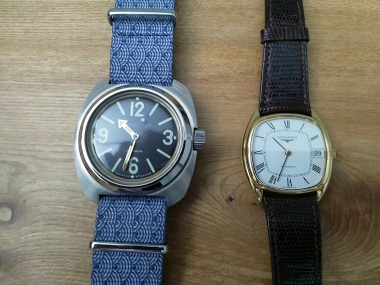 Here is a picture of them from the front. The Vostok is 41mm across and the Longines only 33mm. Very different but both fun! Apologies for the poor picture. I have a long way to go with that skill!