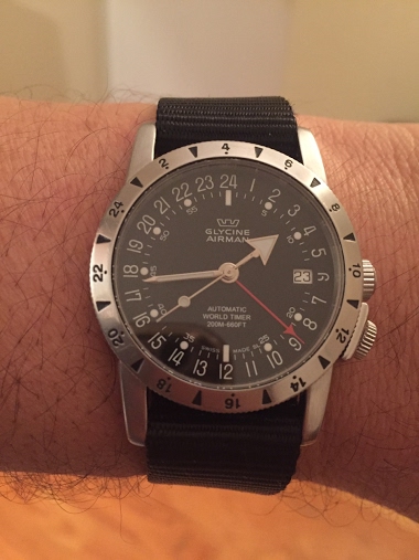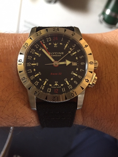 Wearing the Glycine Airman Base 22 GMT today, it’s a pre-Invicta watch I picked up off the used market over 5 years ago. Just put it on a Eulit 2-piece black NATO with a Glycine buckle.