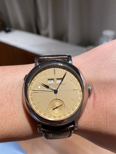 It wears super well, in fact wears more like a 38-39mm, I think with the outer hour ring, it kind of acts like a traditional bezel ring so it draws the watch in smaller.