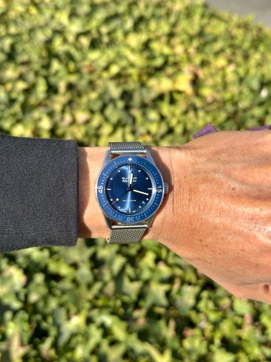 … the dial is beautiful in such dynamic ways and its tone shifts readily with the lighting. I didn’t think I could like this watch anymore until I installed this special mesh bracelet. The clasp design is slender and follows the design of the Bathyscaphe’s lug angles.