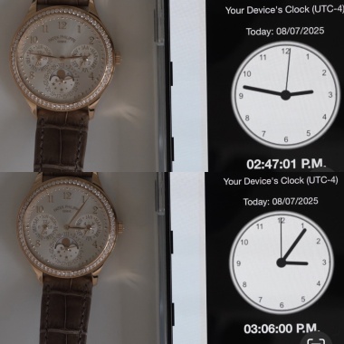 Across dial. If you look at other photos though, it does line up precisely at 8:00. I also took a time lapse video with professional equipment aiming directly down at the watch vs a reference clock. It shows that the differential varies across the dial — so I don’t believe it’s a parallax issue beca