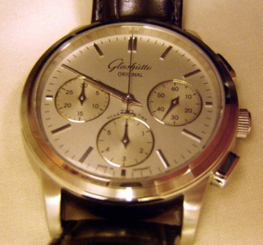 I just thought I would share these two photographs of my Glashutte Senator Chronograph. The design of the face lacks the patternation of the lastest version and does not have the 1/2 second gauge around the edge. I feel this model is more understated and I prefer the brushed steel finish on the case