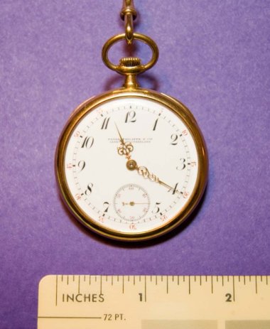 This Patek Philippe pocket watch originally belonged to my great-grandfather and is engraved on the back with his initials. It includes a 15" gold-Pt chain. I'm curious as to what model it is, when it was manufactured, and any other information. I tried gently to open it by pressing on the "ears'" b