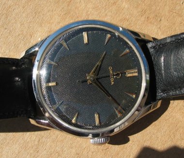 Omega Manual Wind with Black Guilloche Dial Excellent original condition Omega Cal. 283 from about 1954. Perfect in every way: dial, crystal, hands, crown, case and movement are all in like-new condition. Beautiful untouched example of a large screw back case manual winding Omega with deluxe dial. 1
