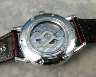 What doesn't show is a curious and charming hologram image embedded in the sapphire caseback window, featuring the GS logo. I'm convinced that it can't be photographed, (certainly not by me.) Maybe if the moon is in just the right phase, the perfect unfiltered light source, and a half a hit of windo