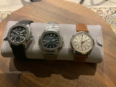 Finally got there with my perfect 3 to work wherever I need to go. Just waiting for a black alligator strap with contrast stitching so 5212 can work in the office. During my quest to get this small set my AD came up trumps with the rare “misty blue” for my wife. Our favourite ladies aquanaut. Having